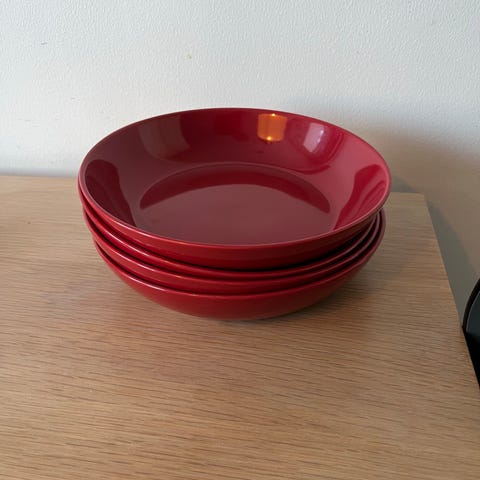 Iittala djupa tallrikar 21 cm i röd färg. Passar som mat- eller pastatallrikar i kök och matsal. Tallrikarna är i hårt material lämpligt för daglig användning. Kan användas både till vardag och vid dukning för flera personer. 125 sek st.