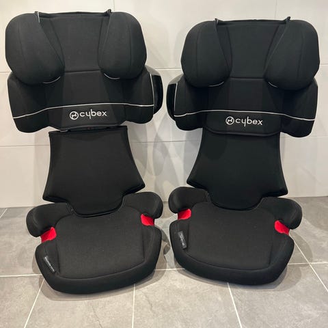 Bilbarnstolen är framåtvänd och har justerbart nackstöd och sidokrockskydd. Klädseln är i mörk/svart textil.