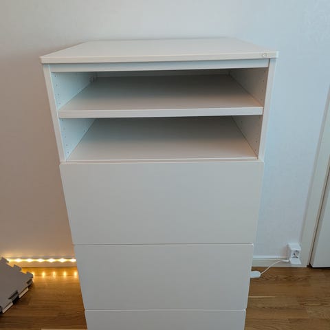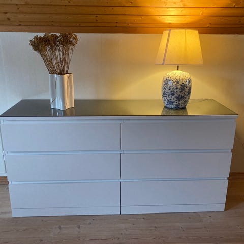 IKEA Malm byrå med 6 lådor i vit färg. Den är i helt ok skick och en vit glasskiva följer med som man lägger ovanpå. En av listerna som sitter mellan lådor gick sönder tidigare och en egen vit list sitter där nu. Det ser bra ut när lådor är monterade.