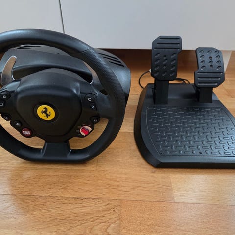 Thrustmaster bilspel med två rattar, växelspak och pedaler. Egentillverkad ram som gör att allt hålls på plats. Ramen är 138 cm lång och som bredast 60cm. Allt fungerar perfekt.