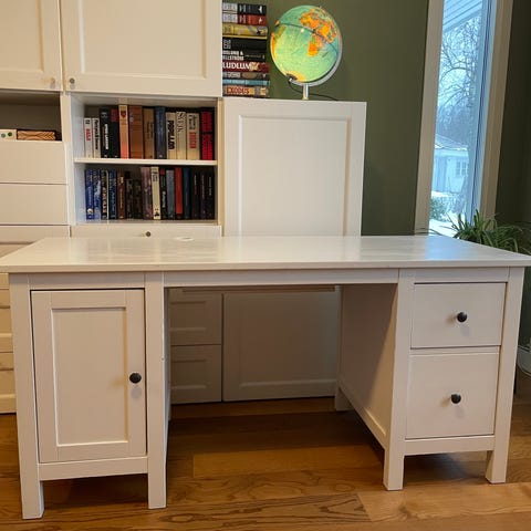 Skrivbord med stol till. Kan även köpas separat om ni vill. Öppningen till vänster är 36 cm bred och på höjden är det 47 cm.