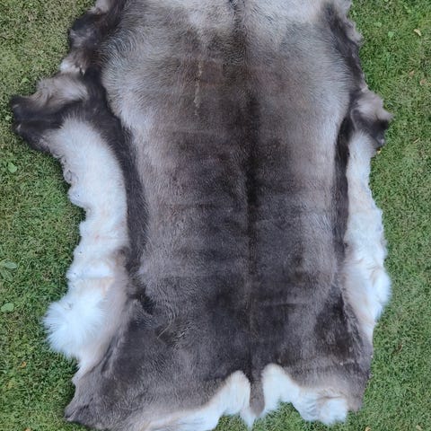 Renskinn i naturfärgade toner med ljus och brunmelerad päls på ovansidan och ljus, slät baksida. Passar som inredningsdetalj på golv, stol eller bänk, eller som värmande lager vid utomhusbruk. Formen är oregelbunden enligt skinnets naturliga kontur. 120 X 80 Cm