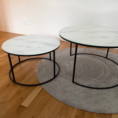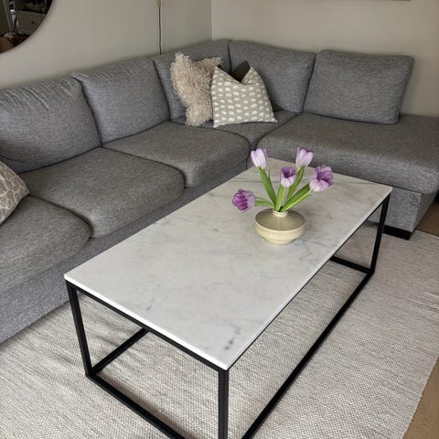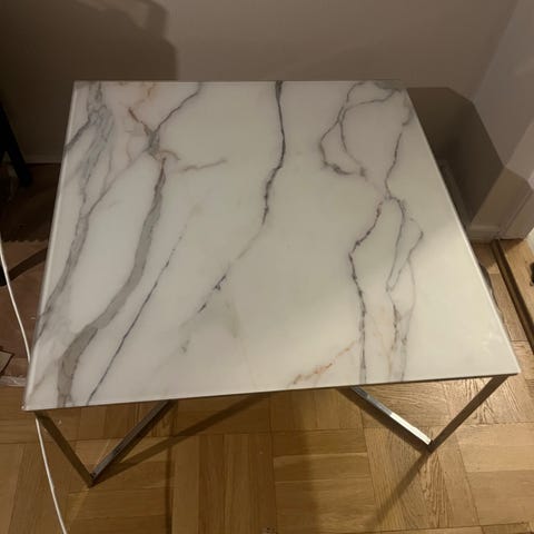Soffbord från Mio med glasskiva i marmorstil, Ramen är guldkrom.