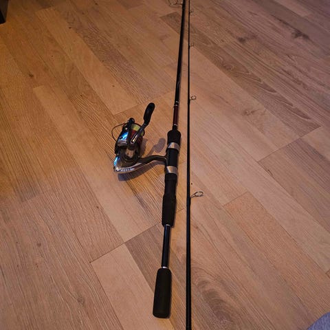 Fladen Ambition 240 fiskespö med rulle. Tvådelat spö med längd 240 cm, färg svart med röda detaljer. Spöt är utrustat med flera spöringar och har en rulle monterad i rullfästet. Rullen är i metall med röd och silverfärgad finish samt påspolad lina. Passar för allroundfiske från land eller båt beroende på vald utrustning och lina.