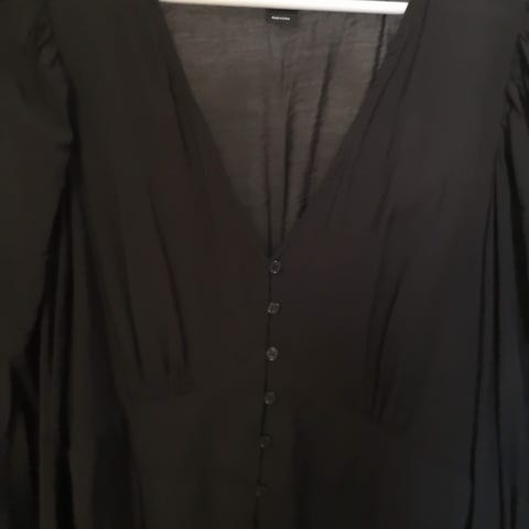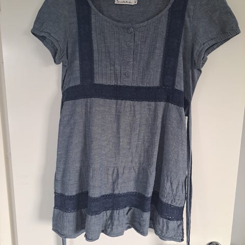 Söt tunika med korta ärmar och en dekorativ volang runt halsringningen. Tunikan har en smickrande passform med en lätt insvängning i midjan och knäpps med knappar framtill.