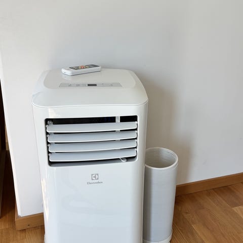 Frigidaire portabel luftkonditionering i vit färg. Enheten är fristående och kan flyttas mellan olika rum efter behov. Passar för inomhusbruk där man önskar kyla ner luften under varmare perioder. Exakta tekniska specifikationer som kylkapacitet och energiklass framgår inte av underlaget.
