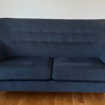 Blå tygsoffa med plats för 2–3 personer. Soffan har rundade armstöd och knapptuftad rygg, vilket ger ett klassiskt uttryck. Klädseln är i tyg och soffan står på ben i mörkt trä eller träliknande material. Passar i vardagsrum, gästrum eller mindre utrymmen där man vill ha en kompakt sittlösning.