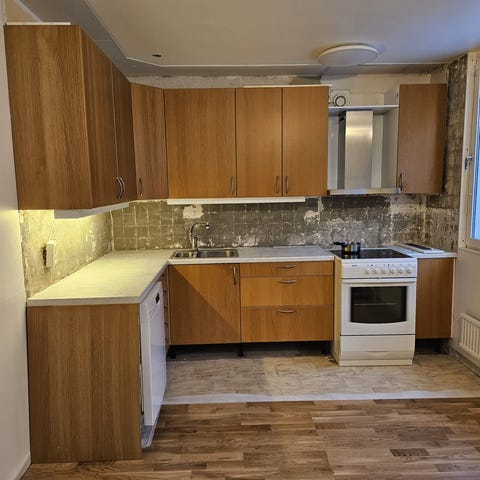 Äldre kök i bra skick med el spis som lite snvändes. , fläkten ingår i te. Den ska bort mellan 23-27 mars.