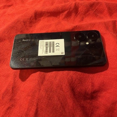 DOOGEE Note 56 Android-telefon med 64GB lagring och 3GB RAM. Telefonen har en stor färgstark skärm med tunna kanter och droppformad frontkamera. Svart baksida i plast, medföljer laddare, USB-kabel och genomskinligt skal. Perfekt för appar, sociala medier och vardagsbruk.