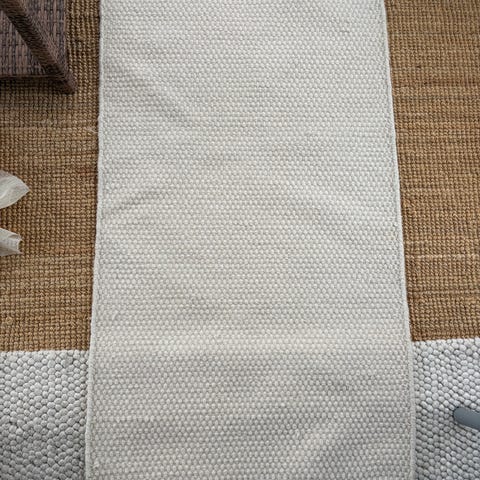 IKEA matta som är tvättbar. Mattan är vit med diskret mönster i kontrastfärg. Passar exempelvis i hall, kök eller mindre rum. Materialet är vävt textilmaterial.