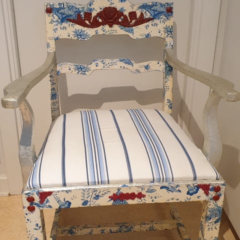 Röd betsade ben i massiv bok, rygg o sits med Nozag fjädrar.