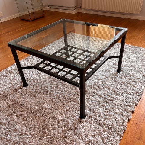 &Tradition soffbord i glas och metall. Rektangulär bordsskiva i klart glas med underrede i mörklackerad metall. Underredet har dekorativa detaljer, bland annat bladformade inslag och lindade metallpartier. Passar som soffbord eller vardagsrumsbord.