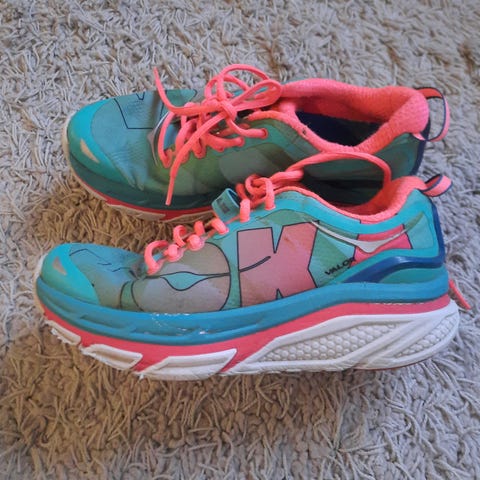 Hoka löparskor i storlek 40. Skorna har ovandel i svart meshmaterial med vit logotyp och kraftig vit mellansula. Modellen är avsedd för löpning och annan träning på hårt underlag och ger dämpning och stöd vid användning. Bondi modellen är liten i storlek.