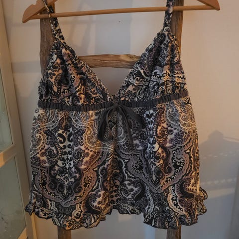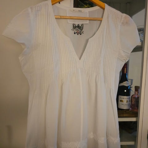 Odd Molly blus för dam i storlek 1. Blusen är vit med smala ränder och har broderade detaljer framtill och baktill. Tillverkad i bomull med tunna justerbara axelband och knytning fram. Passar perfekt till sommaren!