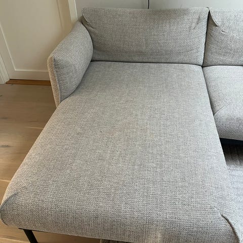 Soffan har några mindre hål/slitage i tyget (se bilder), men inget som påverkar funktionen. Därav bra pris