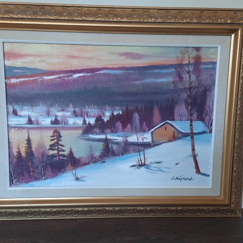 W. Meurman oljemålning föreställande ett vinterlandskap med snötäckta granar, berg och vidsträckt snöfält. Målningen är signerad i nedre hörnet W. Meurman -13.