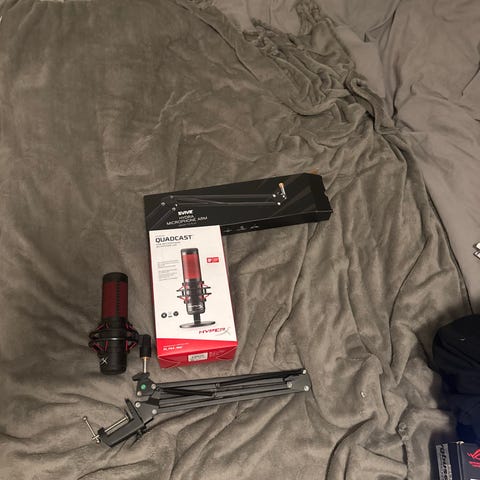 HyperX QuadCast mikrofon i svart/röd färg. Fristående USB-mikrofon med integrerat bordstativ och stötdämpande upphängning. Passar för inspelning av röst, streaming, spel och onlinemöten. Mikrofonen har cylindrisk form med röd mesh och svart kropp samt justerbart stativ för placering på skrivbord.