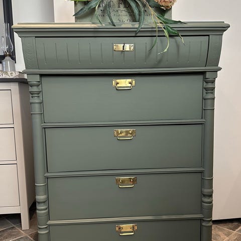 Mycket fin antik byrå i nyrenässansstil, troligen sent 1800-tal. Byrån är renoverad och målad i en beige färg med originalbeslag. Översta lådan är målad i en mullvadsgrå/brun färg, övriga lådor omålade. Alla lådor glider lätt.