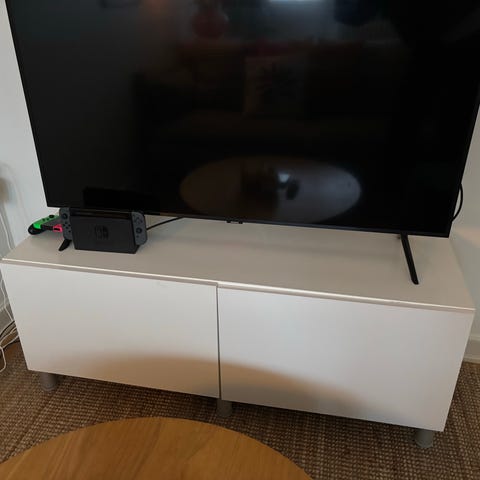Tv/ljud media bänk i björk med 2 utdragbara lådor och fack på var sida för böcker / magasin .