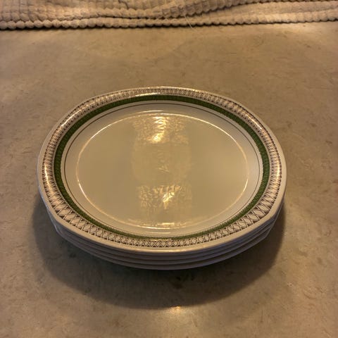 Upsala-Ekeby Sparta tallrikar i porslin med brun mönstrad kantdekor. Setet består av 6st 23-24cm tallrikar, 6st 18-19cm talrikar & 4st 19cm djupa skålar, lämpliga som mattallrikar och assietter. Färgen är vit med brun dekor runt kanten. Tallrikarna passar för vardagsbruk eller som komplettering till befintlig Sparta-servis från Upsala-Ekeby. Viss användning och slitage kan förekomma, se bilder för detaljer som eventuella nagg eller missfärgningar. Kan skickas till självkostnadspris, packas ordentligt.