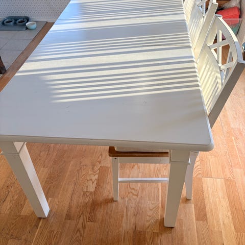 Ett bord i vit färg, i fint skick utan repor, med ben i rostfritt stål, med fyra stolar i läder med ben i rostfritt stål också.