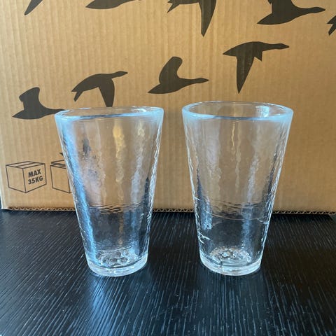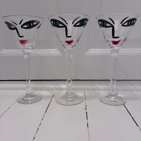 Kosta Boda glas med ansiktsmotiv av Ulrika Hydman-Vallien. Open-Minds. Glasen har dekor i form av stiliserade ansikten i flera färger med ljusgrön bakgrund på kupan och vit fot med prickmönster. Passar som dricksglas eller prydnadsglas i kök eller matsal. Säljes enbart tillsammans.