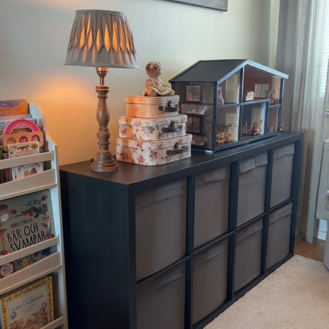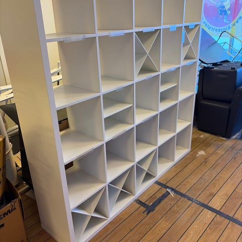 Välbevarade Kallax-hyllor med fem fack i bredd och i höjd. 4 st svartbruna och 6 st vita. Vissa fack har dörrar, andra har speglar men de flesta är öppna. Fungerar perfekt som avdelare på kontor eller större ytor.