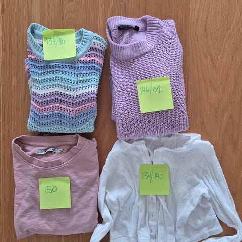 23 stycken byxor, klänningar, tröjor, t-shirts och 1 jacka. Från märkena H&M, Mountain piek eller okänt. Min dotter har vuxit ur dem.