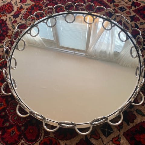 Spegel i rund modell med dekorativ ram i metall i guldfärg. Spegeln har en cirkelformad spegelyta omgiven av en strukturerad ram med cirkulära element. Passar som väggspegel i exempelvis hall, vardagsrum eller sovrum för både spegelfunktion och som inredningsdetalj.