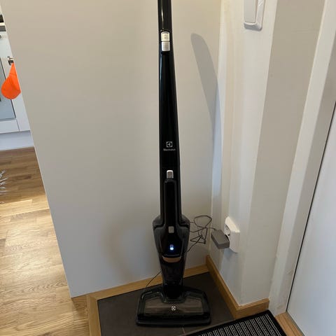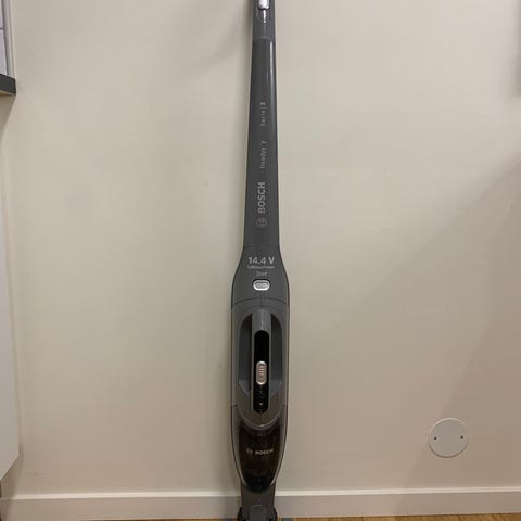 Bosch skaftdammsugare i svart utförande. Sladdlös modell med integrerad dammbehållare. Dammsugaren är självstående vilket underlättar förvaring. Sparsamt använd då vi haft två.