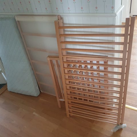 Spjälsäng i vit färg. Består av gavlar och sidor med spjälor samt botten. Passar som sovplats för små barn och spädbarn. Madrass ingår inte. Mått B:60, H:78, L:118 Troligtvis köpt på IKEA.