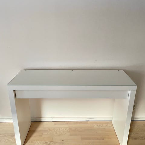 Skrivbord i vitmålat trä med fem lådor framtill. Bordet har svarvade ben och dekorativa handtag i mörk metall på lådorna. Passar som arbetsbord eller sminkbord i hemmiljö. Bordsskivan ger en plan arbetsyta och lådorna ger förvaring för kontorsmaterial eller andra mindre saker.