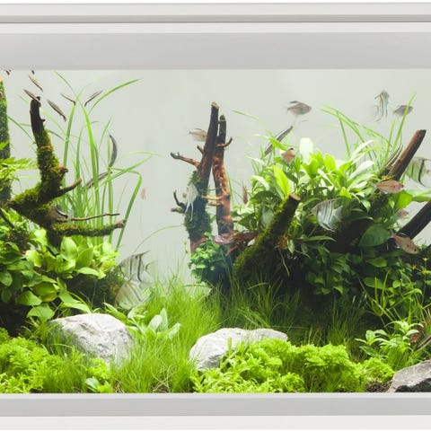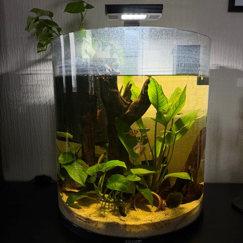 Paludarium. De runda små gröna bladen är Vattenspikblad.