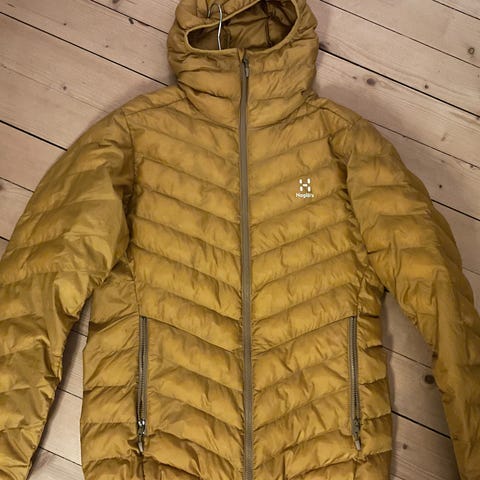 Haglöfs blå dunjacka för herr, vinterjacka i storlek S. Jackan är fylld med vattenavvisande dun (800 cuin fillpower) och har fast huva. Passar som varm ytterjacka under kalla vinterdagar.