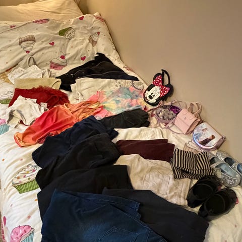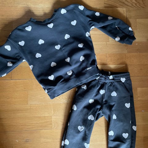 40 stycken byxor, klänningar, tröjor, t-shirts och 1 jacka. Av märkena C&A, Ielm eller okänt. Min dotter har lekt mycket i dem. Kläderna är alla nyinköpta, så hon har varit den första som använt dem.