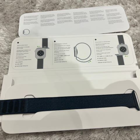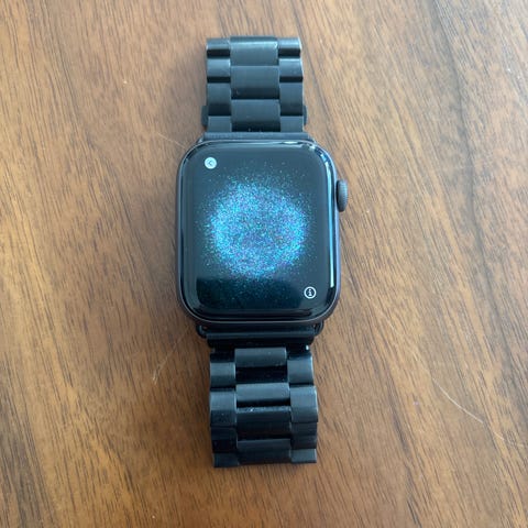 Apple Watch med medföljande magnetisk laddkabel med USB-A-anslutning. Klockan har rektangulär skärm och sportarmband i mörk färg. Laddkabeln är avsedd för trådlös laddning via magnetisk kontakt mot klockans baksida och ansluts till strömadapter eller annan enhet med USB-A-port. Produkten kan användas tillsammans med kompatibla Apple-enheter för tidsvisning, notiser och aktivitetsmätning, samt laddas med den inkluderade magnetiska laddkabeln. Airpodsen gen 2(helt ny från boxen) kan köpas till för 800kr