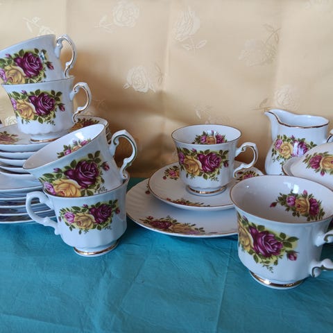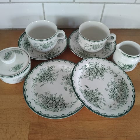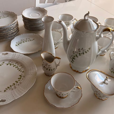 Porslinsservis med fågelmotiv i vit grundfärg med flerfärgade fågelillustrationer. Servisen består av tallrikar i olika storlekar, koppar med fat samt små skålar. Passar för servering av varma och kalla rätter, fika och dessert. Motiven föreställer olika småfåglar placerade på grenar, vilket ger ett naturinspirerat uttryck. Servisen kan användas både till vardag och vid enklare bjudningar. Tillverkat med ensamrätt för Fyrklövern. Även ett gyllene tillfälle för samlare.