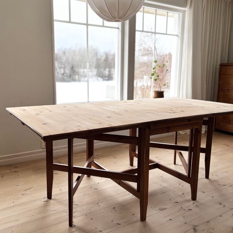 Det här är ett väldigt fint klaffbord i massiv björk. Det finns en klaff på ena sidan så bordet kan stå in mot väggen om man vill använda gavelplatsen och ha benen under bordet. Mycket fint skick, står stadigt, inga större märken eller fläckar. Vacker kant, fin lyster. Benen går lätt att skriva av för platta transport.