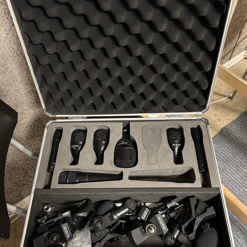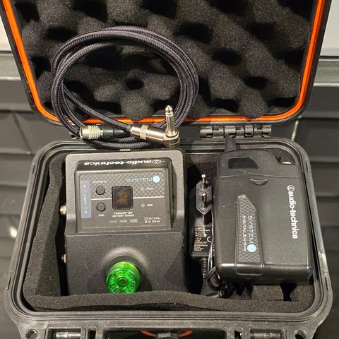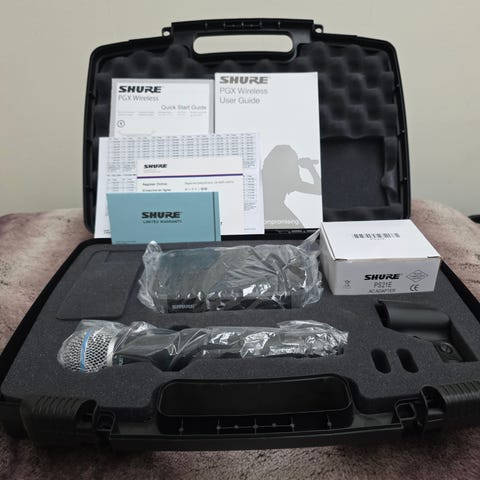 Shure trådlöst mikrofonset med hårt fodral. Setet innehåller handhållen mikrofon, mottagare, nätadapter och kablar placerade i formskuren inredning i väskan. Passar för röst, tal och enklare ljudförstärkning i olika sammanhang där trådlös mikrofon önskas. Svart plastväska med Shure-logotyp på utsidan för förvaring och transport.