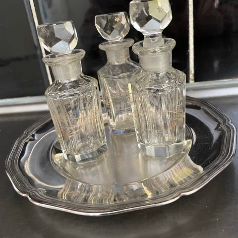 Blandat parti med två bordslampor i glas och metall med blommönster samt diverse hushållsartiklar. Lamporna har kupor i frostat glas med dekor och metallfot i mässingsfärg. I partiet ingår även olika bestick, köksredskap, porslin, glas, fat, skålar och mindre prydnadsföremål. Passar som komplettering till kök och hem eller för den som söker äldre och blandade bruksföremål.