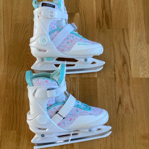 Skridskor för barn i ställbar storlek 33-36. Rostfri skena lika skarp som när den var ny.