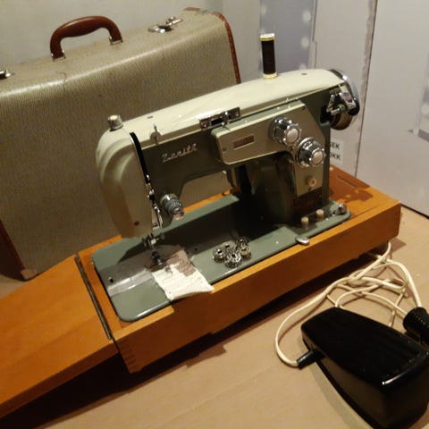Symaskin i fint skick med elkabel, fotpedal, instruktionsbok, skydd och mycket tillbehör. Maskinen fungerar bra, men kärvar lite ibland i tjocka tyger. Servad för 10 år sen och är väldigt lite använd sedan dess. Skyddet är slitet upptill.