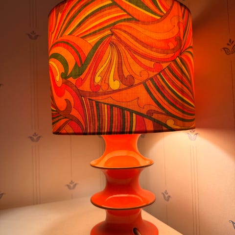 Snygg lampa i orange lackerad metall. Funkar utmärkt, finfint skick. Har ett litet skavmärke på ett ställe på skärmen men syns inte om du inte letar efter det och går lätt att vända mot väggen el dyl. Märkt i botten med ”Rydéns”.