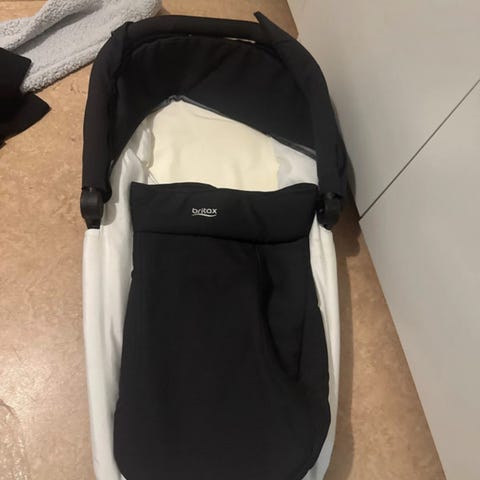 Bugaboo liggdel i tyg med ytterdel i svart och lock i beige. Liggdelen har avtagbar madrassbotten och hård bottenplatta. Passar för spädbarn som ska ligga ner i barnvagn. Fästöglor på sidorna för montering på kompatibel Bugaboo-vagn. Ytskiktet visar mindre bruksspår enligt bilder.