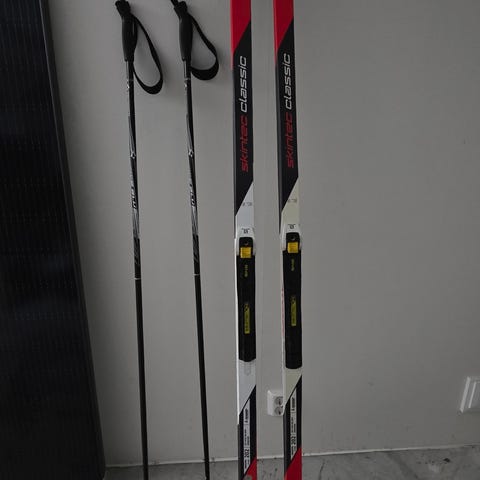 Atomic längdskidor med tillhörande stavar och pjäxor. Utrustningen är avsedd för längdskidåkning och passar för användning på preparerade spår. Skidorna har bindningar monterade och stavarna har remmar för händerna. Pjäxorna är anpassade för längdskidåkning och används tillsammans med de monterade bindningarna. Lämpligt som komplett set för träning eller fritidsåkning på längdskidor.