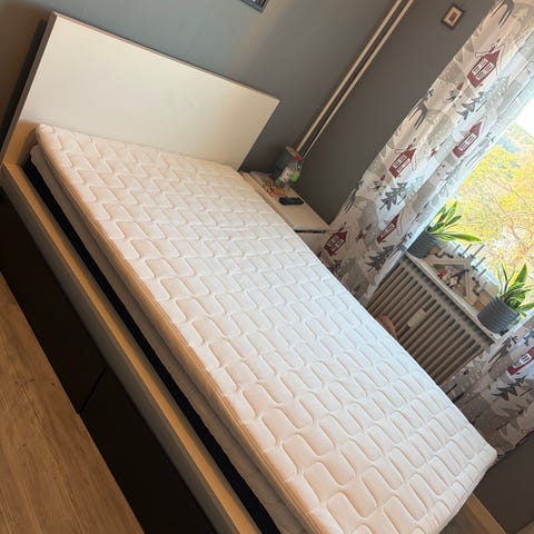 IKEA Brimnes säng samt sänggavel med förvaring och två madrasser. Sängen har utdragslådor på sidorna för extra förvaringsutrymme. Madrasserna är två separata, den ena i fint skick, den andra mer använt, går att få med båda om man vill.
