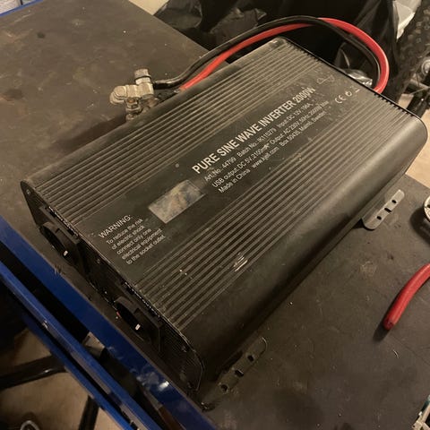 Ströminverter för omvandling av 12V DC till 230V AC. Hölje i metall med kylflänsar och inbyggd strömbrytare på sidan. Utrustad med kabelanslutningar för 12V in samt vägguttag för 230V ut.