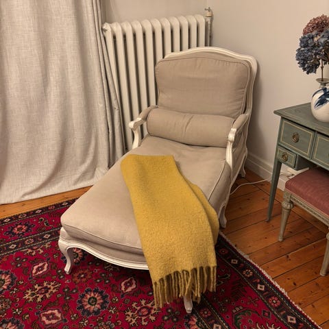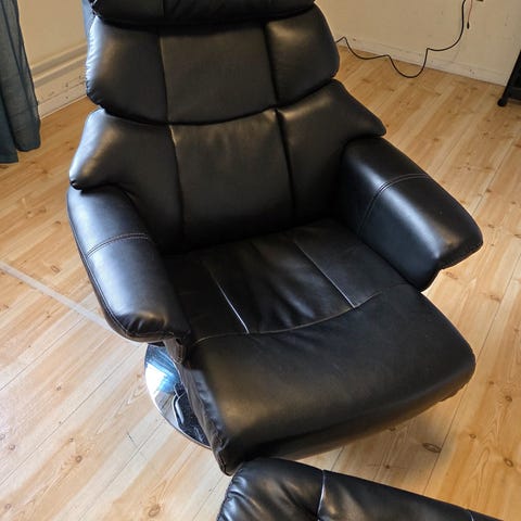 Fotölj med fotpall. Omklädd i ett vackert ljusplått tyg. Ej använd efter tygbytet. Mått fotpall 40x40x45