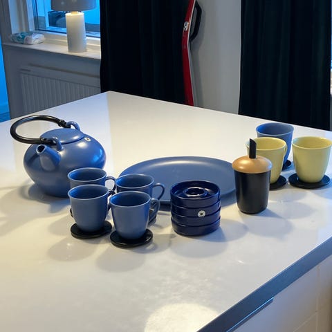 Ett gult uppläggningsfat samt två svarta i olika storlekar.