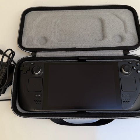 Valve Steam Deck LCD 64gb handhållen spelkonsol i svart färg. I annonsen ingår ett SanDisk Extreme Pro microSD-kort på 1 TB för extra lagringsutrymme. Konsolen visas tillsammans med skyddsväska och laddkabel på bilderna. Lämplig för bärbart PC-spelande och användning av Steam-biblioteket.